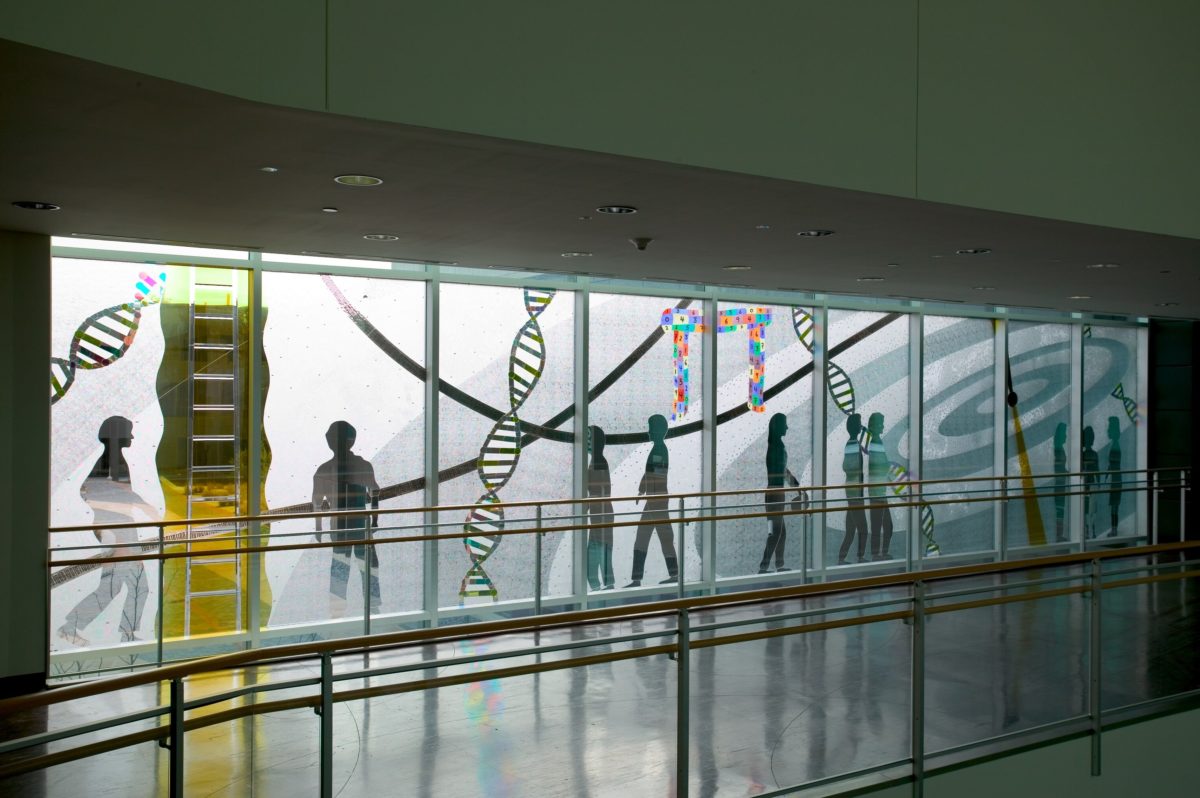 Based out of Seattle, Paul Marioni and Ann Troutner have collaborated in numerous public art commissions in glass, a medium that they view as both elegant and timeless. The artists have worked together over the years to develop techniques allowing them to better integrate their glass-based work and the surrounding architecture. The results are highly functional and low maintenance glass structures that capture and manipulate light, as well as elicit responses from users of the architectural spaces for which they were intended. In Consilience, Marioni and Troutner were interested in personalizing the surrounding architecture. Taking cues from the meaning of the word “consilience,” or “a unity of knowledge or tying together science and humanities,” the work hinges on viewer interaction. It is meant to be appreciated through movement between the different vantage points. The strands of DNA code found throughout the piece represent the deepest look at the structure of life. The intertwining binary numbers to the left, behind the DNA strands, is “information” and represents the largest library ever assembled. At the center, the Pi symbol invokes how mathematics are a foundation of life. The ladder, on the far left, enables a continuous climb through life and the search of knowledge. The yellow aura surrounding the ladder represents the future. Moreover, the large-scale format reminds the viewer of the small part we play and how the human race is a relatively recent development in the universe.