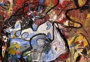 Wray’s electric spiraling canvas throws us into the vortex as if we are Dorothy in Oz or Alice falling down the rabbit hole. In Untitled, a central white vortex undulates downwards creating an illusion of spiraling movement. To the right of the vortex arrows in peachy tones point downward in the direction of the spiral, like a hurricane of increasing energy. The painting is centered in a foundation of earthy tones—watery blues, sandy tans, and grassy greens—that are overlaid with vivid pastels of electric oranges. All of this is topped off with a foreground of thin sharp geometric lines as if thrown about onto the landscape. The soft blue blocks in the center harken back to Wray’s earlier education in architecture, with their precision acting as a necessary fulcrum to all else that goes awry around them. There is a clear sense of layering—one that is technically difficult to achieve in Abstract Expressionism—lending a trompe l’oeil effect of three dimensions, imparting a sense of background and foreground, static and energy, precision and expression.