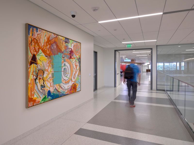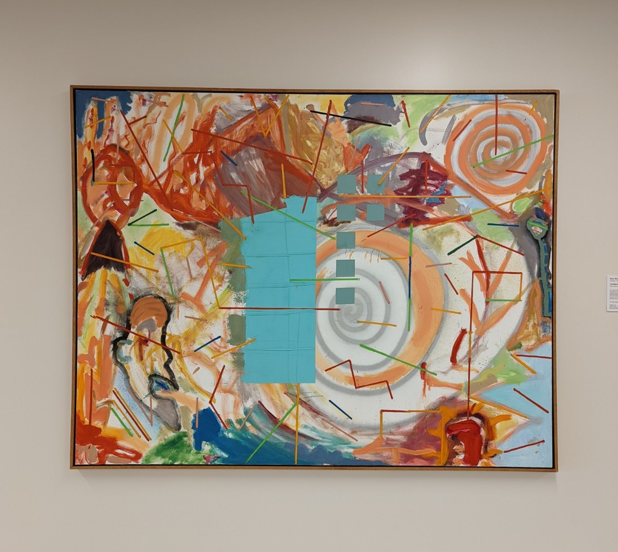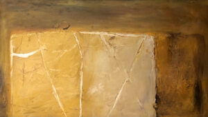 Wray’s electric spiraling canvas throws us into the vortex as if we are Dorothy in Oz or Alice falling down the rabbit hole. In Untitled, a central white vortex undulates downwards creating an illusion of spiraling movement. To the right of the vortex arrows in peachy tones point downward in the direction of the spiral, like a hurricane of increasing energy. The painting is centered in a foundation of earthy tones—watery blues, sandy tans, and grassy greens—that are overlaid with vivid pastels of electric oranges. All of this is topped off with a foreground of thin sharp geometric lines as if thrown about onto the landscape. The soft blue blocks in the center harken back to Wray’s earlier education in architecture, with their precision acting as a necessary fulcrum to all else that goes awry around them. There is a clear sense of layering—one that is technically difficult to achieve in Abstract Expressionism—lending a trompe l’oeil effect of three dimensions, imparting a sense of background and foreground, static and energy, precision and expression.