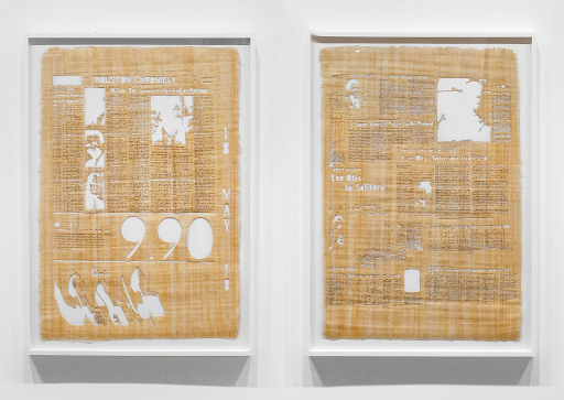 His diptych Eroding Witness, Season 3 Episode 20 (2018) is composed of two archival documents reproduced on laser-cut papyrus. The document on the left, from the front page of the Houston Chronicle, boasts the headliner article “30-Year Pot Sentence Justified or Political?” a clear sensationalizing of the arrest of local Black resistance leader Lee Otis Johnson. The corresponding document on the right is a compilation of shorter articles concerning Johnson’s sentencing and well-being after his 1968 arrest. While a student at Houston’s predominantly Black Texas Southern University, Johnson led the 1967 TSU student strike and was a leader of the TSU riot, in which a policeman was killed and nearly five hundred students were arrested. In 1968, Johnson was arrested for giving marijuana to a policeman and was sentenced by an all-white jury to a prison term of thirty years. While imprisoned, the chant of “Free Lee Otis!” became a rallying cry for students and progressives across Texas who wanted drug law reforms and the promotion of civil rights.