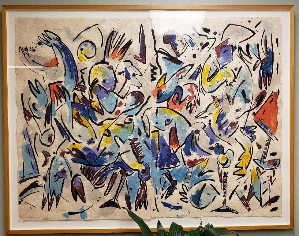 Espada has proven to be one of the most important and prolific Texas painters of our time. His abstract expressionist paintings consistently deliver an air of joy and liveliness that makes him an endearing member of the Houston art scene. Fisherman’s Catch is a great example of this colorful enthusiasm. The work is created from two large pieces of handmade paper that display a richly textured surface that include many fine fibers of various colors. This textured surface is then the genesis for a narrative of watery themes surrounding a well-lived life by the beach. Made with washes of color in vivid tones of blues and purples, the squirming fish may indicate Espada’s early life in Puerto Rico. An atmosphere of carefree, ocean-going days with plentiful summers permeates the canvas. The painting delivers an immediacy of a slippery catch-of-the-day wiggling in the net with rhythmic movement and buoyancy. The work brings forward the salt air of life near the ocean. Thick black watery strokes lend the slightest hit of form, while washes of blues with hints of sunset reds and yellows fill out the spaces. Slight splotches and drops of washed color appear irregularly like serendipitous occurrences and perfectly capture the scene of a water-soaked day at the beach.