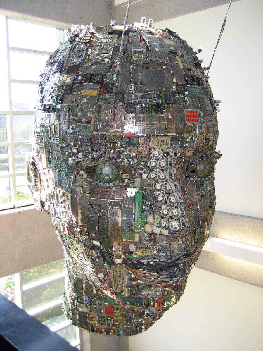 Artists Ralph Helmick and Stuart Schechter collaborated on a number of public art projects in the 1990s and early 2000s. The artists started with a portrait of humanity and created a computer composite of world racial types to create an androgynous sculpture. Modulation was commissioned for the Melcher Center for Public Broadcasting at the University of Houston and utilizes scrap broadcasting equipment to make up the giant head. The sculpture reflects our societies love and dependence on contemporary media with an aim to illustrate the unconventional beauty of our age. Hundreds of technological components are attached over a steel wire frame armature to form the “skin” of the piece. These castoff elements represent the detritus of our age. Modulation incorporates several active elements such as video monitors as the “eyes.” One eye displays the stations live television, broadcasting from the center. The other shows the volume transmission of the station’s radio programming, and a halo of functioning computer fans encircle the head. Standing directly underneath the sculpture and looking up the viewer can see a 2000 element LED map showing a night satellite image of greater Houston. On the perimeter of the piece there is a functioning oscilloscope displaying the center’s television signal. These many functions mold together to create Modulation.