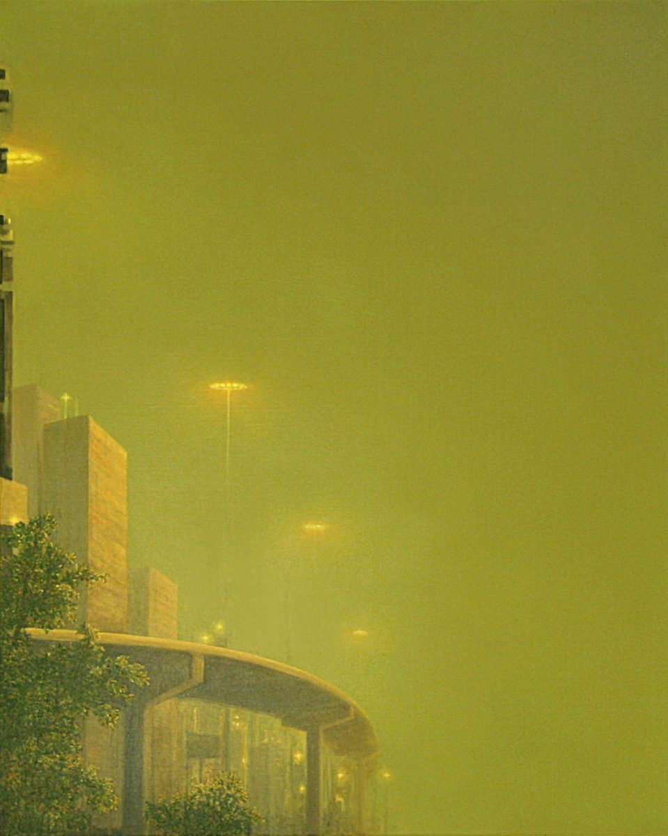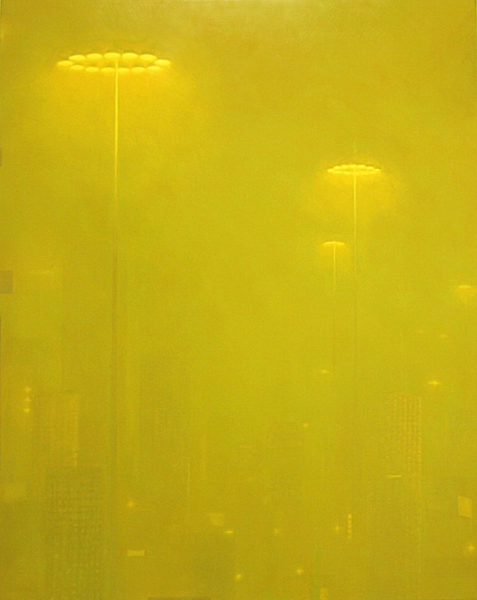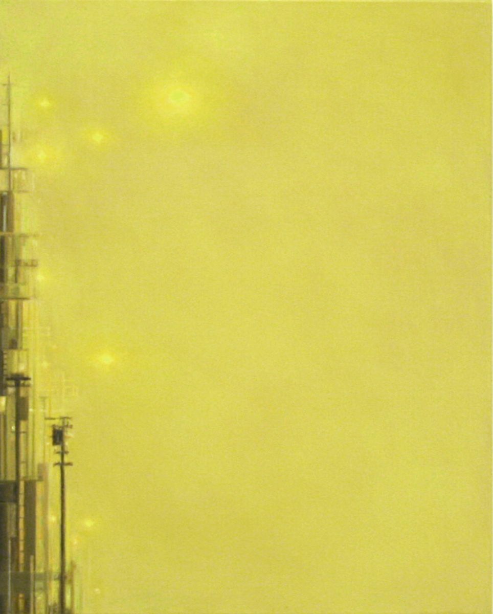 Janaki Lennie is an Australian artist, who spent many years in Houston while she obtained a M.F.A from the University of Houston. Her inspiration comes from the traditional Western landscape paintings, but rather than deserts and cacti, Lennie makes the sky her subject. Taking the landscape back to its truest sense of place, she works in layers to create these pieces. While her inspiration comes from the tradition of romantic landscape painting, it is free of the nostalgia associated with it. The hazy colors evoke chemical and light pollution. The imagery is a literal nod to Houston’s skyline, chemical plants, and freeway lights. These paintings lure the viewer in and offer an opportunity to reconsider the relationship with the natural world and the city’s built environment. There are ten pieces in Lennie’s Provisional Space—Houston, each showing a different experience from the view of Houston’s sky.