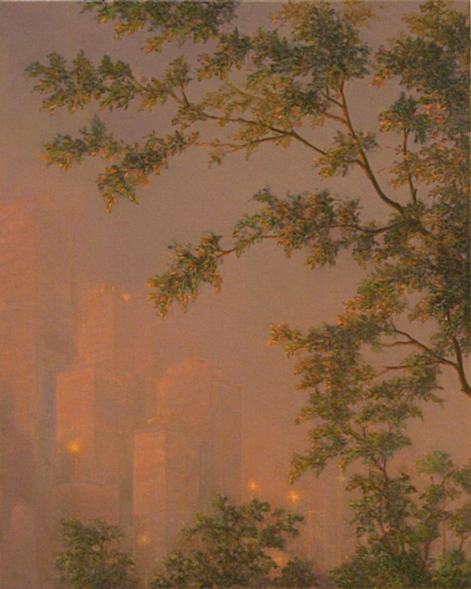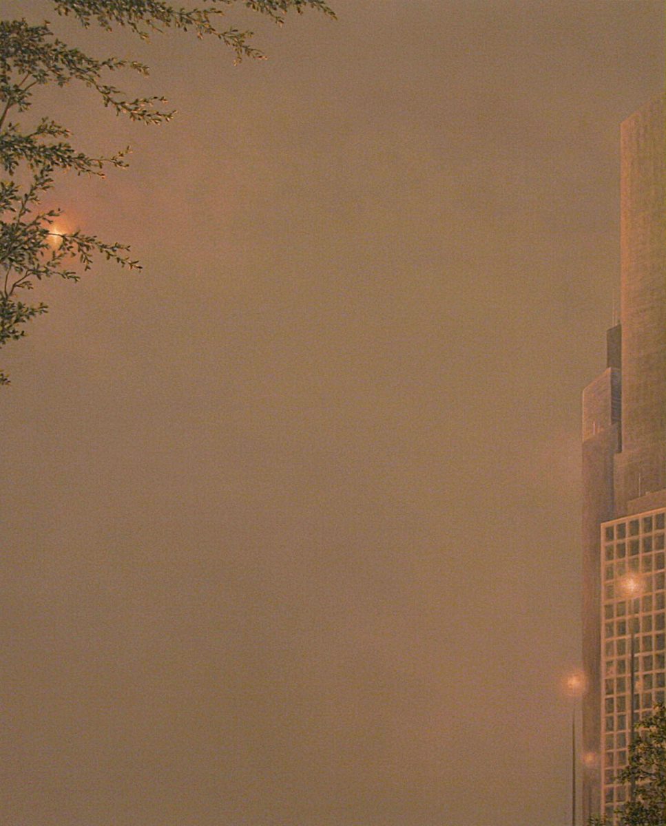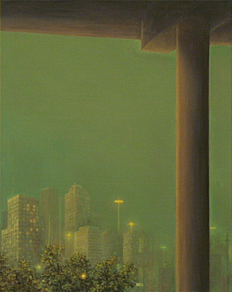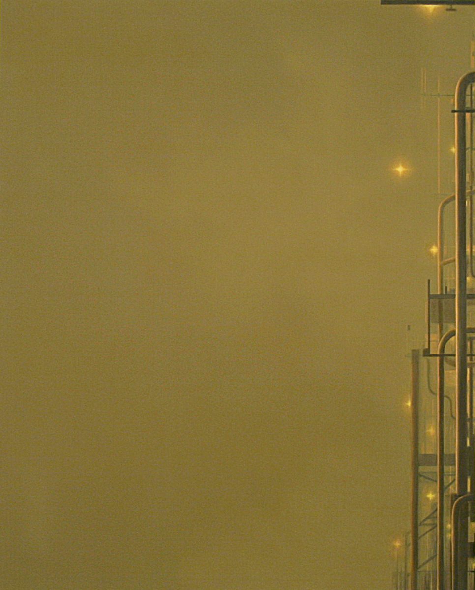Janaki Lennie is an Australian artist, who spent many years in Houston while she obtained a M.F.A from the University of Houston. Her inspiration comes from the traditional Western landscape paintings, but rather than deserts and cacti, Lennie makes the sky her subject. Taking the landscape back to its truest sense of place, she works in layers to create these pieces. While her inspiration comes from the tradition of romantic landscape painting, it is free of the nostalgia associated with it. The hazy colors evoke chemical and light pollution. The imagery is a literal nod to Houston’s skyline, chemical plants, and freeway lights. These paintings lure the viewer in and offer an opportunity to reconsider the relationship with the natural world and the city’s built environment. There are ten pieces in Lennie’s Provisional Space—Houston, each showing a different experience from the view of Houston’s sky.