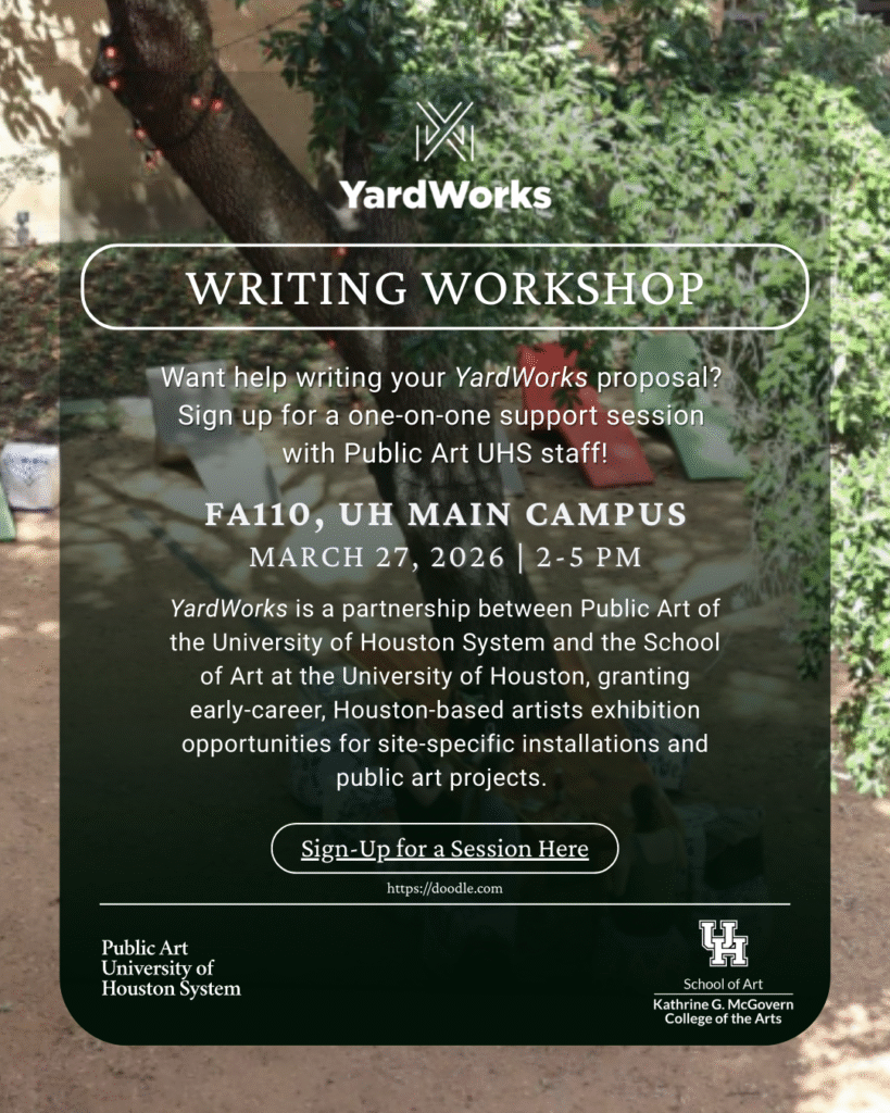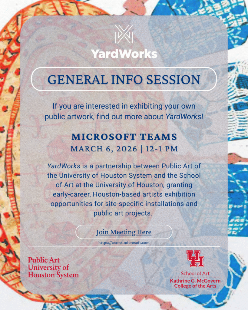 The YardWorks Selection Committee invites proposals from UH MFA graduate students, Houston-area artists, and artist teams at the early stages of their careers to design, fabricate, and install a temporary work of public art for the Louise J. Moran Fine Arts Courtyard on the campus of the University of Houston.